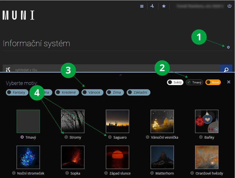 Uživatelé si mohou tmavý motiv (tmavý design stránek IS JABOK) zapnout na titulní straně IS JABOK ozubeným kolečkem vpravo nahoře a výběrem některého z tmavých motivů.